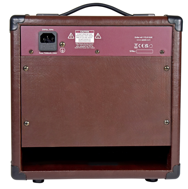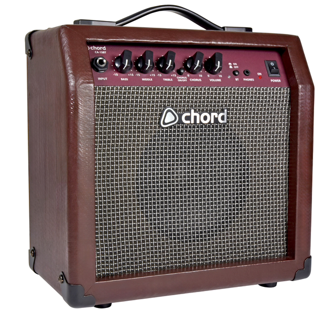 Combo amplifier for electro-acoustic guitars with 3-band EQ and built-in chorus effect. A built-in Bluetooth receiver enables playback of backing tracks from a smart phone and a stereo jack output is provided for silent practice with headphones. The 15 Watt amplifier section drives a full-range speaker set, fitted into a closed back speaker cabinet. Finished in durable brown vinyl covering with a basket weave speaker cloth.