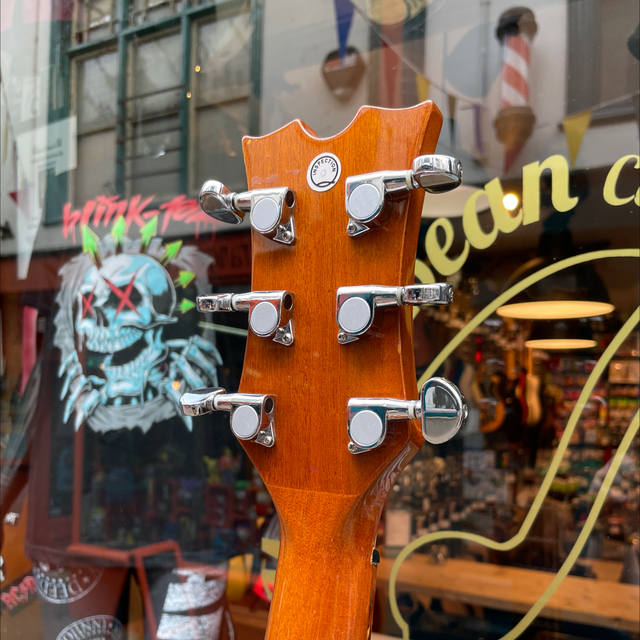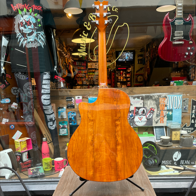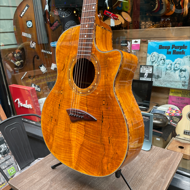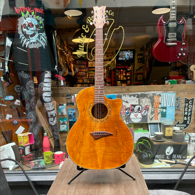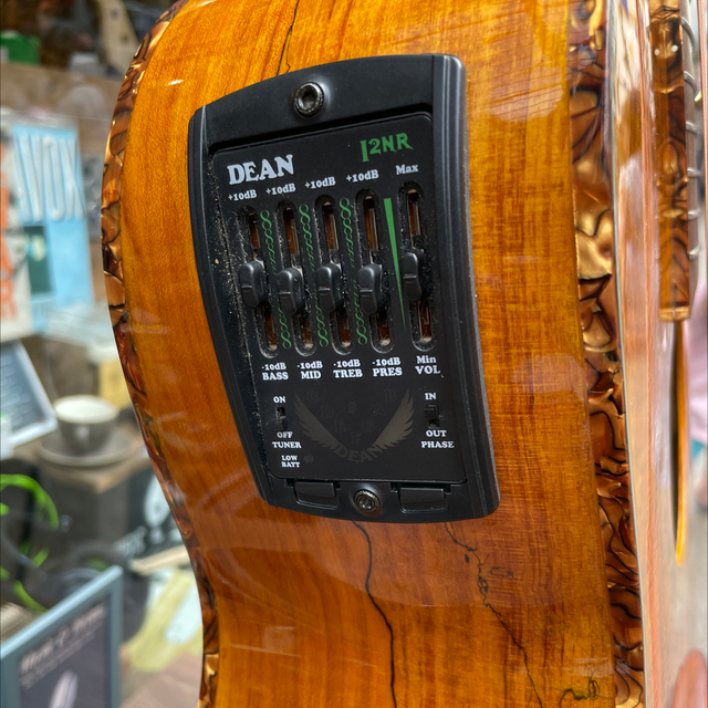Single cutaway Exotica-style body, spalt maple top, back, and sides, round soundhole with woodcut rosette, celluloid binding, set mahogany neck, 14/20-fret rosewood fingerboard with dot inlays, matching headstock, three-per-side chrome tuners, rosewood bridge, Dean DMT 12NR pickup with four-band EQ and tuner.