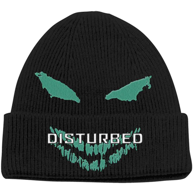 An official licensed unisex 100% Acrylic Beanie Hat featuring the Disturbed 'Green Face' design motif. This high quality headwear is available in a black colourway.