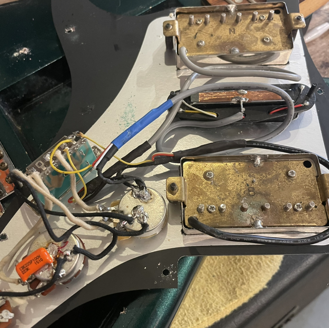 1990s Encire guitar, heavily modified to a good standard, wiring looks neat with quality components. The pickup set boasts a HHH format with two full size chrome covered pickups at neck and bridge and hot rails in the centre, the humbuckers appear to be quality wax potted pickups stamped N and B but no makers mark to tell of unfortunately.