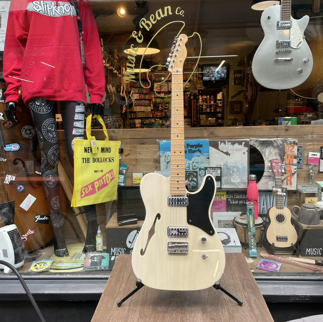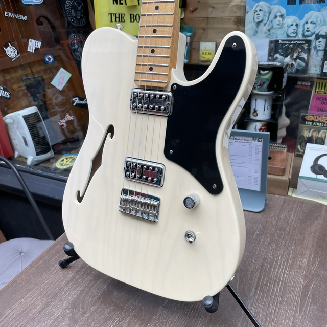 In White Blonde finish, this Fender Cabronita Thinline Tele combines 'Cabronita' stylings with Fender's classic telecaster design for one cool-looking and solid sounding guitar. Its semi-hollow Ash body is very resonant, and its dual Fideli'Tron humbuckers are impressive—the neck has surprising depth, and the bridge lends plenty of drive and twang. It certainly sounds different than most humbucker-loaded teles. The unique pickguard shape and vintage strat-style bridge add to its appealing aesthetic. Controls are simple here, only three-way pickup switching and Master Volume, but that's all you need with this Fender Cabronita Thinline Tele.