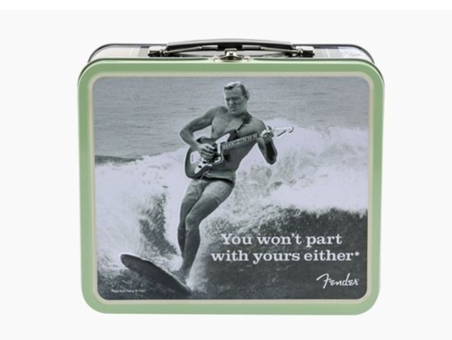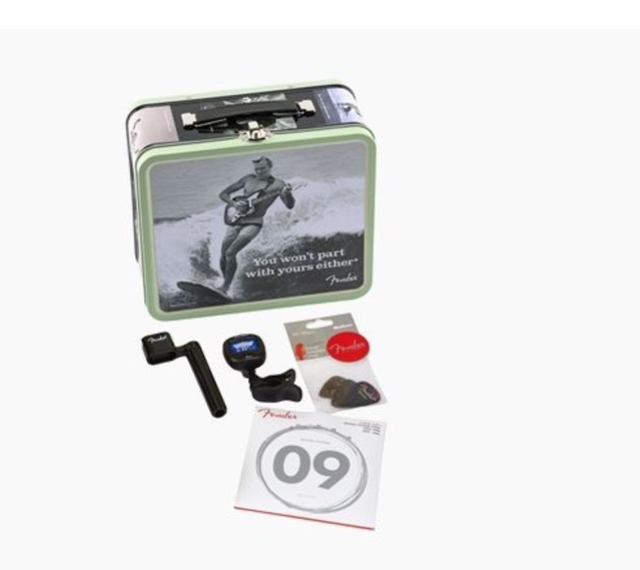 This cool and collectible Fender Lunchbox is a great way to keep your small guitar accessories within reach while also showing off some authentic retro Fender vibe. The outside of the lunchbox is covered with artwork from the “You won’t part with yours either” ad campaign— featuring an embossed design of the iconic surfer playing a Jaguar® while riding a wave—and the inside is packed with all the necessities. You get a set of 250L Nickel Plated Steel electric guitar strings, a string winder, 12 medium shell picks and an FT-1 Pro clip-on guitar tuner. This essential kit makes a great gift for any guitar player or diehard Fender fan.