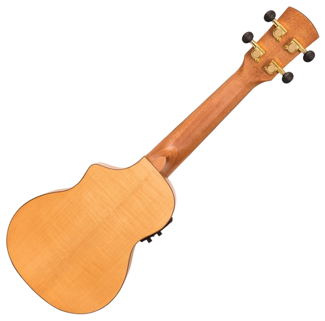 The Lake Maple Series Electro-Acoustic Soprano Ukulele with stunning appointments that include a figured flame maple top, back and sides, wood bindings, intricate faux abalone rosette design, capped heel, okoume neck, ABS nut, walnut capped headstock, walnut fingerboard with pearl inlays, black walnut bridge and gold plated die-cast machine heads with black buttons is indeed, dressed to impress.
