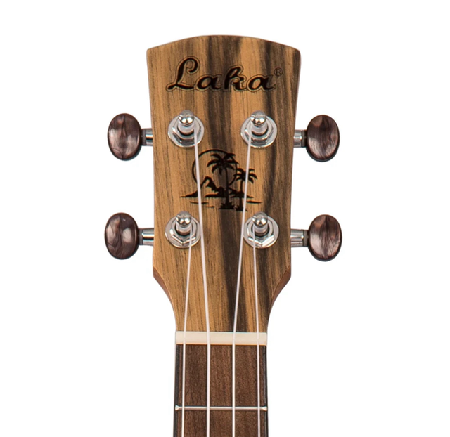 Visual appointments continue with tortoiseshell for the body bindings and soundhole, dao capped headstock with laser etched Laka motif and palm tree design, ABS nut and die-cast chrome machine heads with black buttons.