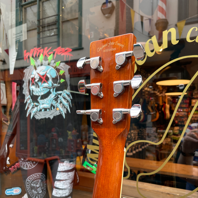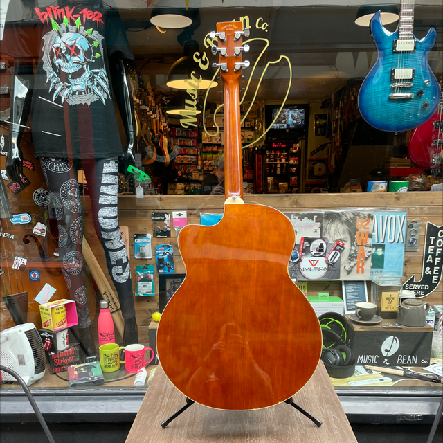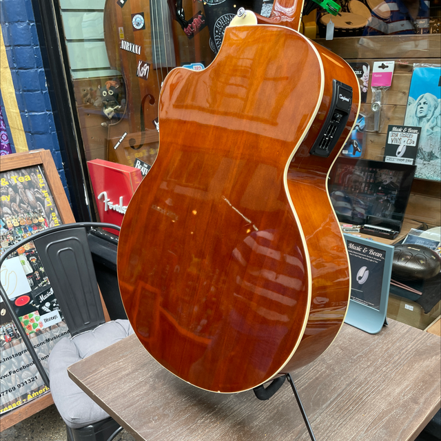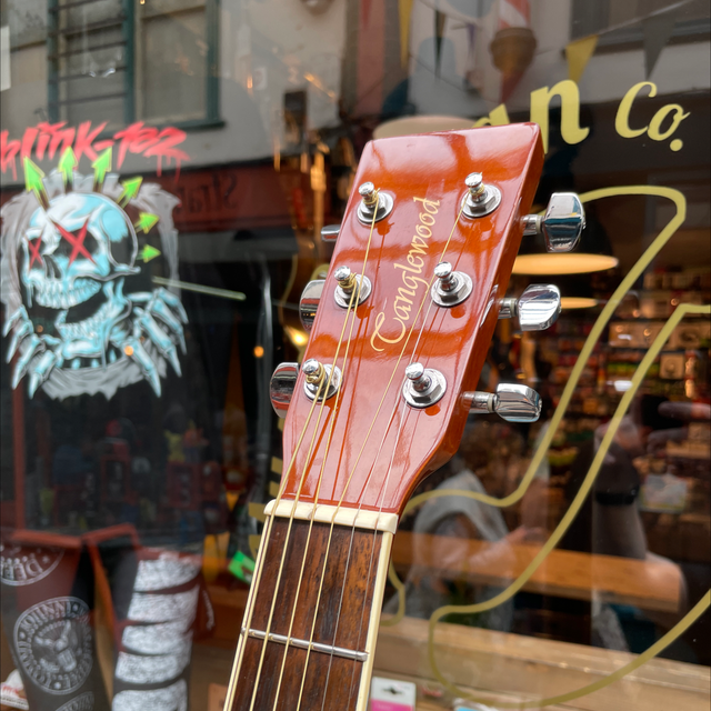 The mahogany body of this Tanglewood super jumbo gives is a warm tone, not as bassy as the dreadnoughts but amplified with active pickups has a rich sound