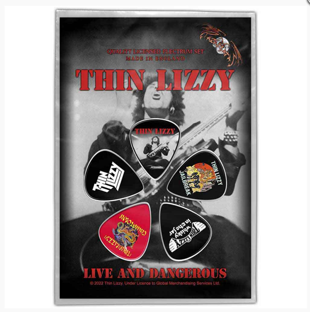 Official licensed Thin Lizzy Plectrum Pack featuring the 'Live & Dangerous' design motif.